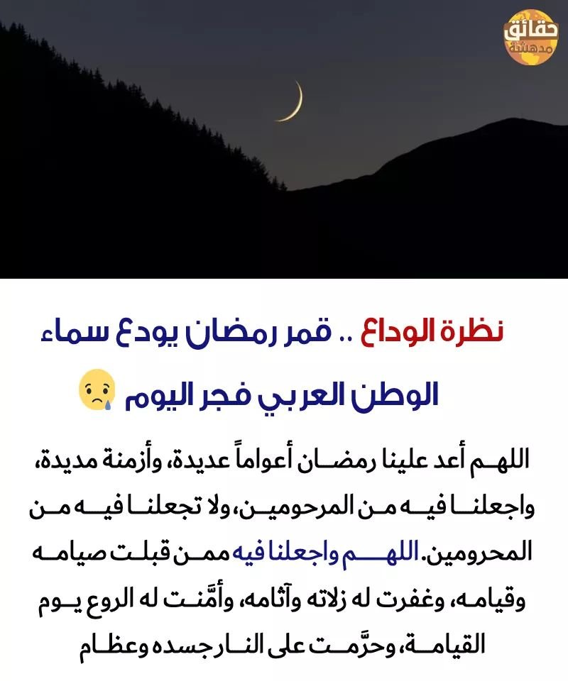 لا تحزنوا على وداع رمضان .. شهر الخير والبركات والمغفرة والرحمات ..بل احمدوا الله تعالى أن بلغكم إياه ، وافرحوا وكبّروا الله عز وجل أن هداكم لصيامه وقيامه …لا تودعوه ، بل اصطحبوه إلى باقي عامكم كل يوم هو معكم ..رمضان ليس شهراً ، بل أسلوب حياة وبداية التغيير .لا تودعوه ، بل افسحوا له المجال ليحيا معكم وتحيوا به طوال العام ..الصوم لا ينتهي أبدا ، القرآن لا يُهجر مطلقا …والله سبحانه وتعالى بقربنا دائماً …